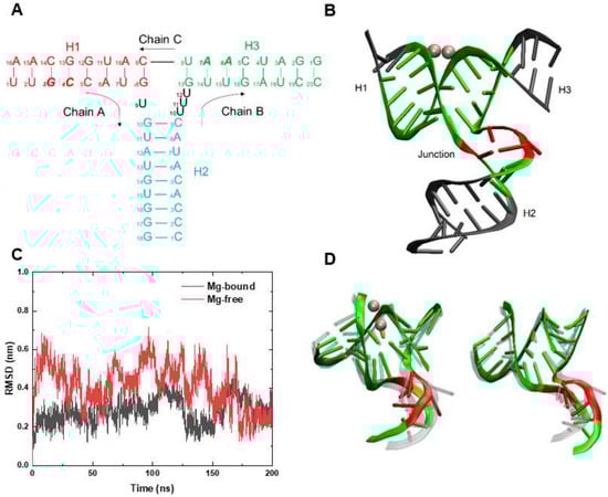 As mentioned above, the 3WJ-pRNA is the 3WJ domain of bacteriophage φ29 pRNA and connects the ATPase-binding region and two interlocking loops of the pRNA. The structure of the 3WJ-pRNA was extracted from PDB entry 4KZ2 []. In this crystal structure, there are two divalent metal ion-binding sites, which were discovered using Mn2+ ions in experiments []. Actually, the same coordination sites are found to be occupied by physiologically relevant Mg2+ ions as those for Mn2+ ions []. Thus, we constructed configurations of the Mg-bound and Mg-free 3WJ-pRNA for use in simulations.