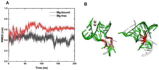 The structural characterizations of the core region in both systems at T = 400 K. (A) The RMSDs of the core region in Mg-bound (black) and Mg-free (red) 3WJ-pRNA with respect to the initial structure. (B) Representative snapshots of the core region in the Mg-bound (left panel) and the Mg-free (right panel) 3WJ-pRNA. The initial structures are shown as transparent, and the final structures are shown in normal color.