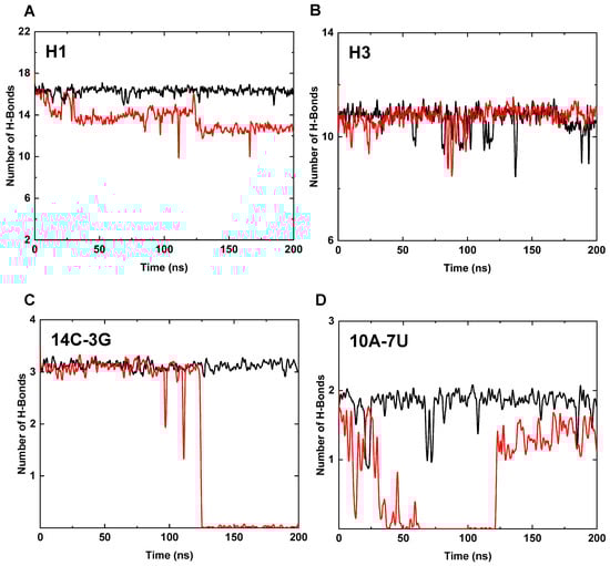 The hydrogen bonds in various helices at T = 400 K. (A) The number of hydrogen bonds in H1 (Mg-bound in black, Mg-free in red, the same below). (B) The number of hydrogen bonds in H3. (C) The number of hydrogen bonds between 14C-3G of H1. (D) The number of hydrogen bonds between 10A-7U of H1.
