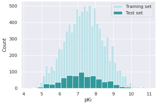 An introduction to the GLASS database is presented in the Materials and Methods (Section 2). It contains over 700 5-HT1A receptor ligands. The pKi values ranged between 4.44 and 10.3, with a median of 7.22. In Figure 1, pKi’s distribution in GLASS (test set) and the curated database (training set) is presented. For both databases, the distributions are similar. The GLASS database was used for the evaluation of the QSAR model.