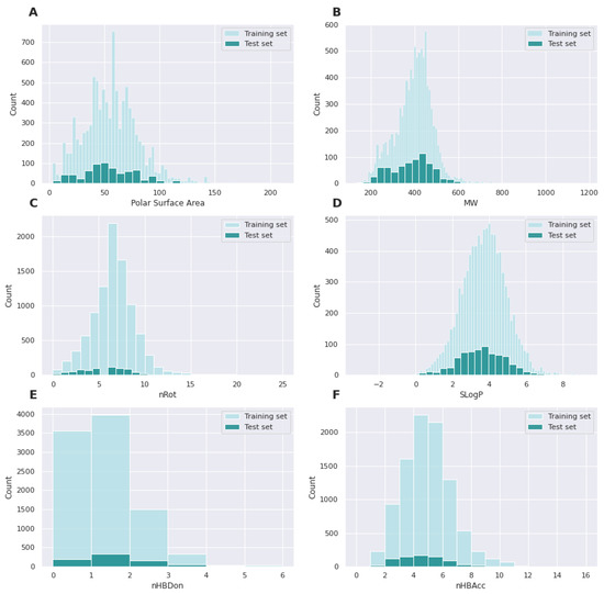Distribution of Lipinski’s rules features values in training and test sets. (A) Polar surface area; (B) MW, molecular weight; (C) nRot, rotatable bonds; (D) SLogP, logP value; (E) nHBDon, number of H-bonds donors; (F) nHBAcc, number of H-bond acceptors.