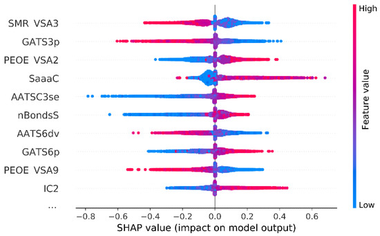 The SHAP plots were produced using an in-house developed Model Interpretation tool, which is publicly available on the GitHub website [52]. The overall variable importance might be reflected by the mean absolute SHAP value which indicates how much on average the variable affects the predicted pKi value. By investigating the obtained results, it might be observed that the marginal contribution for every variable differs and all features are in the range of 0.021–0.088. A short summary of the calculations for the 10 most important variables is presented in Table 4, whereas full results including variable descriptions are available in Supplementary Materials Table S3.