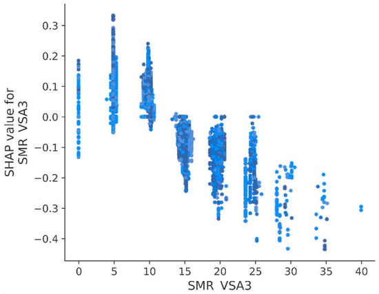 Model analysis in a more detailed way shows trends between variables and their impact on the predicted outcome by the model. For example, Figure 5 presents the relation of the calculated SHAP value to SMR VSA3. It is observed that a value equal to or higher than 15 causes a drop in pKi predicted by the model. In the case of SMR VSA3 ≤ 10, it may be expected that compound affinity for 5-HT1A receptor will increase. SMR VSA represents the polarizability of a molecule; therefore, in light of the observed relation between the descriptor and SHAP value, it might be assumed that too many polarizable groups are not desired in the case of active compounds. Different MR VSA descriptors were found to be important to predict the affinity of compounds against molecular targets. An example might be the model of human ether-a-go-go-related gene (hERG) blockers developed by Moorthy et al. [53].