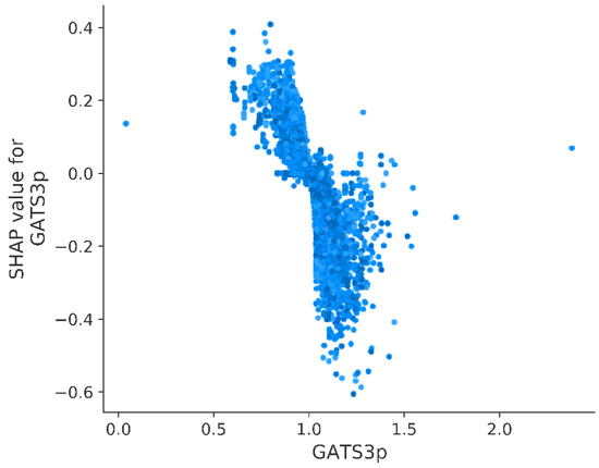 A closer look into the impact of GATS3p on predicted pKi shows that a descriptor value below 1.0 indicates a higher affinity of a molecule to the 5-HT1A receptor (Figure 6). It is worth pointing out that GATS3p has also embedded information about the polarizability of the compound. Topological distribution of polarizability was identified as important for predicting the affinity of molecules against other targets such as mitogen-activated protein kinase-interacting kinases (MNK1, MNK2) [54] or apoptosis inducers for human breast cancer cell line T47D and human colorectal cancer cell line DLD-1 [55].