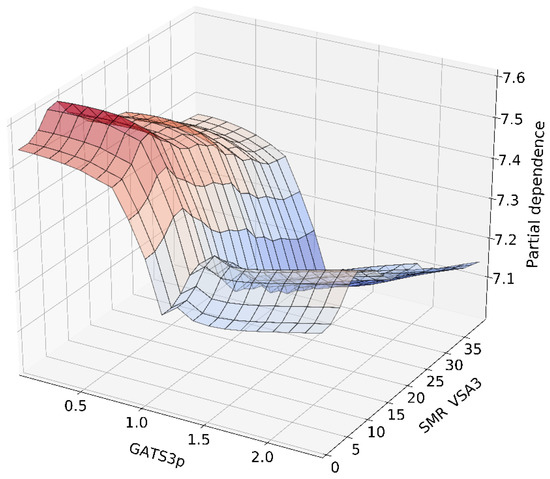 Analysis of the variables’ impact on the pKi value predicted by the model could also be directed from global effects and condensed into local and more detailed form. Going from SHAP analysis to other available methods of model explanation, it might be advisable to apply the partial dependence plot (PDP) method that shows the marginal effect of one or two features on the predicted outcome by the model [56,57]. PDP can show whether the relationship between predictions and input variable is linear or more complex. For example, when applied to a linear regression model, PDP shows a pure linear relationship, whereas for neural networks, the expected relation will be nonlinear and more complex. PDP analysis is implemented in the AutoML H2O package and developed models can be easily analyzed using internal functions delivered by software. PDP analysis was conducted using an in-house developed tool built on the H2O package, capable of automatically exporting results in the graphical form of 3D plots [52]. An example of the PDP result for the two most important variables according to SHAP analysis (SMR VSA3 and GATS3p) is visualized in Figure 7. It is observed that in the case of both variables, lower values positively influence the pKi predicted by the model. The opposite direction in model outcome is observed for higher values of both variables. It is worth mentioning that within the analyzed domains, the functional relationship is not monotonic. Due to the nonlinearities affecting the predictions for both variables, the result of the interaction is complex. It might be challenging to describe it by a single number representing directional effect such as in linear models with variable interaction terms. Such simplification will be possible, but it will be occupied by the loss of information represented by the model. The complete result of PDP analysis, depicted by over 700 unique plots, is provided as Supplementary Material File S2.