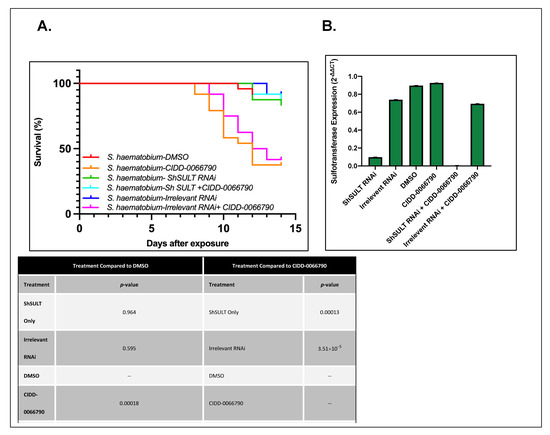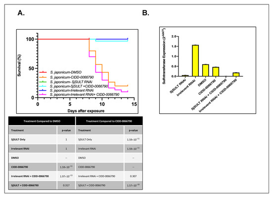S. japonicum, showed a similar result as S. mansoni and S. haematobium. Gene expression analysis displayed a reduction in SjSULT expression in the SjSULT RNAi and the SjSULT RNAi + CIDD-0066790 groups when compared to controls (Figure 4B). SjSULT expression in the remaining treatment groups was similar to control groups. S. japonicum parasites treated with irrelevant RNAi, SjSULT RNAi, and DMSO resulted in 100% survival. S. japonicum parasites treated with CIDD-0066790 alone and irrelevant RNAi + CIDD-0066790 resulted in 26% and 13% survival, respectively, while parasites treated with SjSULT RNAi + CIDD-0066790 resulted in 96% survival (Figure 4A).
