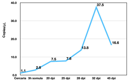 Concentration (copies/μL) of SmSULT expressed in male infections throughout the life stages.