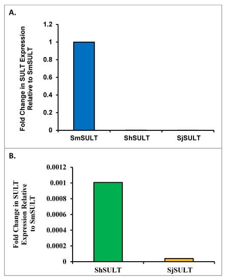 Quantitative Real Time PCR (qRT-PCR) was used to determine the relative quantities of SULT transcribed in different species of schistosomes. 150 µg of cDNA was used for relative quantification with gene-specific primers and iTaq™ Universal SYBR® Green Supermix (BioRad, Hercules, CA, USA) containing hot-start iTaq DNA polymerase, dNTPs, MgCl2, SYBR® Green I dye, and ROX reference dye. Primers were designed using PerlPrimer v1.21 (Supplementary Table S1) for each SULT gene (SmSULT: Smp_089320; ShSULT: Sha_104171; SjSULT: FN317462.1) and assayed for efficiency at 1:0, 1:5, 1:25, and 1:100 cDNA concentrations.