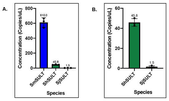 Comparison of concentrations (copies/μL) of sulfotransferase transcripts across all three Schistosoma species. (A) Mean concentration of SmSULT (610 copies/μL), ShSULT (45.77 copies/μL), and SjSULT (1.533 copies/μL) per well. (B) Concentration of ShSULT and SjSULT for closer comparison. Based on 3 individual experiments. Std. Deviation: Sm = 63.53, Sh = 3.48; Sj = 1.097.