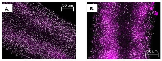 Fluorescence in situ hybridization of ShSULT. Midsection of S. haematobium male. Cells positive for ShSULT stained positive for TAMRA-Tyramide, magenta. ShSULT-specific probe was used at a concentration of 100 ng/mL DAPI was not included. FISH was performed on whole worms. (A) Z-stack image. (B) Whole section. These photos are representative of photos from four worms.
