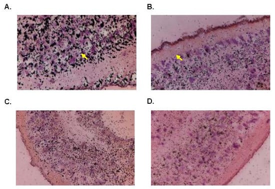Silver Grain Placement in Radiolabeled-OXA Treated Worms. Silver grains in H&Estained parasite sections. Yellow arrows indicate prominent clusters of silver grains. The clustering is less prominent the longer the worm is exposed to OXA. (A) Day 2, (B) Day 4, (C) Day 6, (D) Day 12.