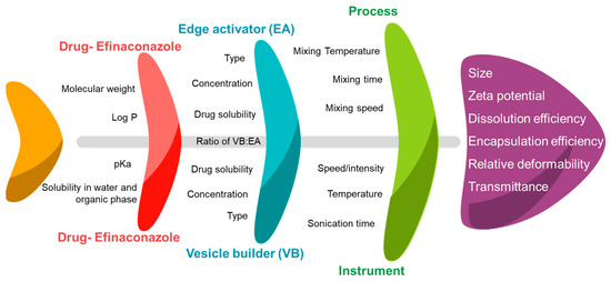 For risk-analysis operation to configure the cause–effect relationship between CFAs and CPPs and the CQAs, the Ishikawa fishbone diagram was constructed [25,26]. In the formulation of spanlastics, particle size, zeta potential, entrapment efficiency, relative deformability, transmittance, and dissolution efficiency were identified as key CQAs that influence the biopharmaceutical properties of spanlastics, based on the literature available and preliminary experimentation [17,27].