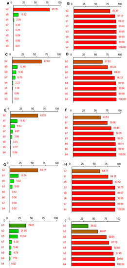 Pareto charts portraying the effect of selected critical formulation and process parameters on characteristics of efinaconazole spanlastic formulation. (A,C,E,G,I) and (B,D,F,H,J) represent individual and cumulative contribution (normalized squares, %) for particle size (Y1), zeta potential (Y2), relative deformability (Y3), transmittance (Y4), and encapsulation efficiency (Y5), respectively. b1 to b8 represent the values of coefficients for the selected eight factors in the experimental design.