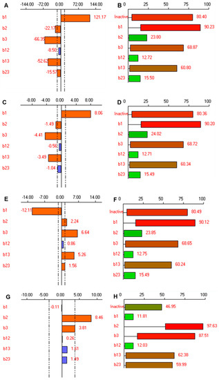 One factor along with its coefficients indicates the effect of that particular factor while the cross-product of two or more factors along its coefficients represents the interaction term among these factors. The sign in front of the terms is indicative of the synergistic or antagonistic effect of the factors. The synergistic effect can be expected with the term having a positive sign while factors with a negative sign indicate an antagonistic effect on the outcome. Lenth’s graphical analysis was carried out to identify the optimum CFA level. Further, the graphical analysis also indicates the levels of the factors that are active in response. The bars corresponding to the active factors can be easily identified as these bars exceed the two dotted vertical reference lines. The two dotted reference lines represent the experimental variance (Figure 3A,C,E,G). The probability of each active effect is represented graphically as box plots and coefficients of Bayesian analysis were also calculated (Figure 3B,D,F,H) [46].