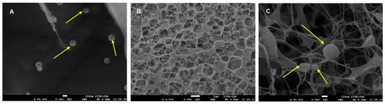 Representative scanning electron microscope images of (A) efinaconazole-loaded spanlastic vesicles, (B) blank carbopol gel, and (C) efinaconazole-loaded spanlastic vesicles loaded into carbopol gel for transungual delivery. Arrows indicate spanlastic vesicles.