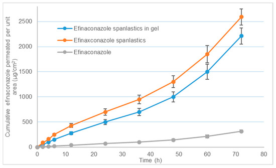 Bovine hoof membranes are commonly used to study nail delivery as their structure resembles the human nail [23]. The cumulative amount of efinaconazole permeated in 72 h from spanlastics and spanlastics dispersed in the gel were 2591 ± 162 and 2211 ± 158 μg/cm2, respectively (n = 6). The comparative permeation profiles are shown in Figure 5.