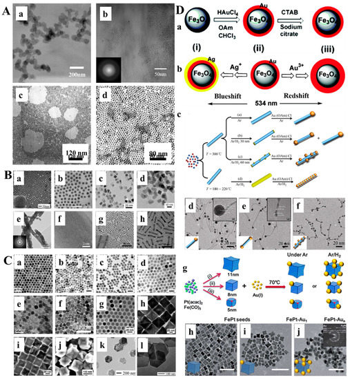 (A) Single-component metal nanoparticles. (a) TEM image of 65 nm Fe NPs; (b) TEM image of 3.7 nm Ni NPs; (c,d) TEM images of (c) 6 nm and (d) 9 nm Co NPs. (B) Metal alloy nanoparticles. (a,b) TEM images of (a) 11 nm and (b) 16 nm FePd NPs; (c,d) TEM images of (c) fcc-FePt@Fe3O4 and (d) fct-FePt NPs; (e) TEM image of FePt NWs and (f) HRTEM image after annealing; (g,h) TEM images of (g) FePt NWs and (h) FePt NRs. (C) Metal oxide nanoparticles. (a) TEM image of 16 nm Fe3O4 NPs; (b–d) TEM images of (b) 7 ± 0.5 nm, (c) 8 ± 0.4 nm, and (d) 10 ± 0.8 nm Fe3O4 NPs. The scale bars are 20 nm; (e) TEM image of octahedral Fe3O4 NPs; (f) TEM image of Fe3O4 nanoprisms; (g–i) TEM images of (g) 14 nm spherical and (h) 32 nm and (i) 53 nm truncated octahedral FeO NPs and (j) SEM image of truncated octahedral FeO NPs; (k,l): TEM images of (k) Co(OH)2 and (l) CoO NPLs. (D) Heterostructures. (a,b) Schematic illustrations of the syntheses of (a) Fe3O4@Au [(i) Fe3O4; (ii) Fe3O4@Au; (iii) hydrophilic Fe3O4@Au] and (b) Fe3O4@Au@Ag; (c) Schematic illustration of FePt−Au HNWs. FePt NWs were first prepared at high temperature, and then Au nanocrystals were grown onto them to form FePt−Au HNWs. By control over the amount of H2, different morphologies were obtained, such as (d) tadpole-like, (e) dumbbell-like, and (f) bead-like HNWs; (g) Schematic illustration of FePt−Au heterostructured NPs and (h−j) TEM images of (h) FePt concave nanocubes and (i) FePt−Au1 and (j) FePt−Aun heterostructured NPs. The scale bars are 50 nm. Reprinted with permission from Ref. [44]. Copyright 2018 Copyright Zhu Y. et al.