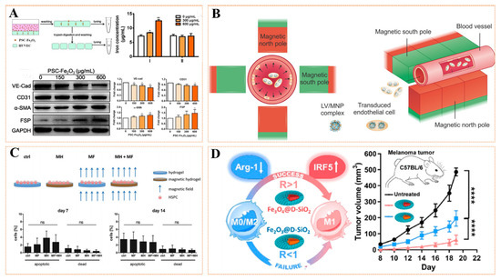 (A) Magnetic nanoparticles (Fe2O3@PSC)-labeled VECs and their effects on the expression of related factors. Reprinted with permission from Ref. [102]. Copyright 2019 Copyright Wen T. et al. (B) The eNOS, a vascular protective gene, was overexpressed in ECs using a complex of lentivirus vectors and MNPs, and then localized on the vessel wall in a radially symmetric manner by a magnetic field. Reprinted with permission from Ref. [94]. Copyright 2016 Copyright Vosen S. et al. (C) Effects of magnetic macroporous hydrogels prepared by magnetic nanoparticles composite PEG hydrogels on the function of human hematopoietic stem and progenitor cells (HSPCs). Reprinted with permission from Ref. [103]. Copyright 2018 Copyright Rodling L. et al. (D) Magnetic nanoparticles (Fe3O4@D-SiO2 and Fe2O3@D-SiO2) rely on the IRF-5 signaling pathway to polarize M1 and downregulate M2-related Arg-1, thereby affecting the expression of related cytokines, and can be used for tumor vascular injury therapy. Reprinted with permission from Ref. [99]. Copyright 2019 Copyright Gu Z. et al. The results were considered significant at * p < 0.05, ** p < 0.01, *** p < 0.001, **** p < 0.0001.