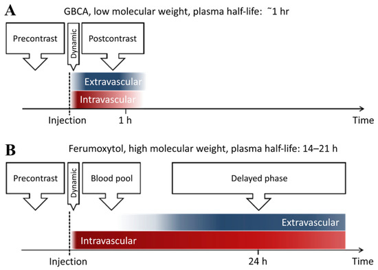 (A) Gadolinium-based contrast agent (GBCA) and (B) ferumoxytol (a superparamagnetic iron oxide nanoparticle)-reinforced phase. Compared with GBCA, ferumoxytol shows a longer intravascular half-life. Reprinted with permission from Ref. [132]. Copyright 2017 Copyright Toth G.B. et al.