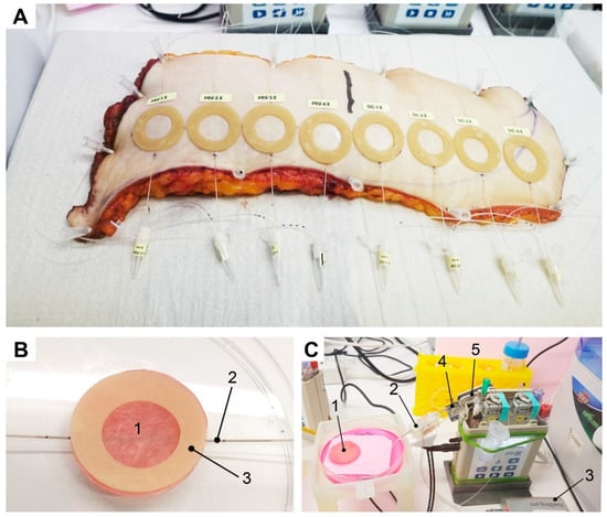 OFM is a sampling technology for clinical and preclinical drug development studies and biomarker research. OFM was designed for continuous sampling of analytes from the interstitial fluid (ISF) of various tissues (e.g., skin, adipose tissue, brain). It provides direct access to the ISF by insertion of a small, minimally invasive, membrane-free OFM probe with macroscopic openings [27]. OFM is capable of sampling lipophilic and hydrophilic compounds [34], protein-bound [35,36] and unbound drugs, neurotransmitters, peptides and proteins, antibodies [37,38,39], nanoparticles and nanocarriers, enzymes, and vesicles. Thus, OFM sampling accesses the entire biochemical information of the ISF regardless of the analyte’s molecular size, protein-binding property, or lipophilicity. For sampling, linear OFM probes (a/dOFM-P-15, Joanneum Research, Graz, Austria) were implanted at a depth of approximately 1 mm into the dermis of skin explants (Figure 2A) and skin equivalents (Figure 2B) using sterile cannulae (Sterican 0.90 × 70 mm, B. Braun, Melsungen, Germany). In case of skin explants, entry and exit points were sealed using cyanoacrylate adhesive (732, Panacol, Steinbach, Germany). The OFM probes were operated using OFM tubings (SCS001), OFM bags (PEB001), and OFM pumps (MPP102 PC, all Joanneum Research, Austria) in push-pull-mode at flow rates of 1 µL/min. Flow rates were verified by calculation, taking the extracted volume of ISF/perfusate (OFM sample) and sampling interval into consideration. The perfusate used to operate the OFM probes consisted of a physiological electrolyte solution for medical infusion purposes (ELO-MEL Isoton, Fresenius Kabi, Graz, Austria) with an added concentration of 1% human serum albumin (Albunorm, Octapharma GmbH, Heidelberg, Germany).