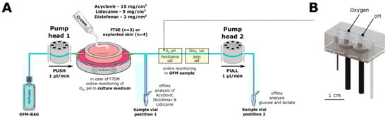 OFM probes were perfused with the perfusate (pump head 1) which equilibrates with the ISF of the surrounding tissue and is withdrawn by the pump head 2 (OFM sample). To measure critical tissue parameters directly in tissue rather than in the culture medium, OFM samples were collected at the outlet of the OFM probe which was inserted directly in either FTSE or skin explants (Figure 3A). Consequently, concentrations of culture parameters (i.e., oxygen, pH) and metabolites (i.e., glucose, lactate) found in the OFM sample are more representative of the state of the tissue than those found in the culture medium. Furthermore, the integration of a custom-made microfluidic flow-through cell and commercial sensors allowed the online measurement of oxygen, pH (Figure 3B), glucose, and lactate. FTSE and ex vivo skin explants were cultured in the incubator for up to 24 h while monitoring the mentioned parameters to assess whether the tissues remained viable.