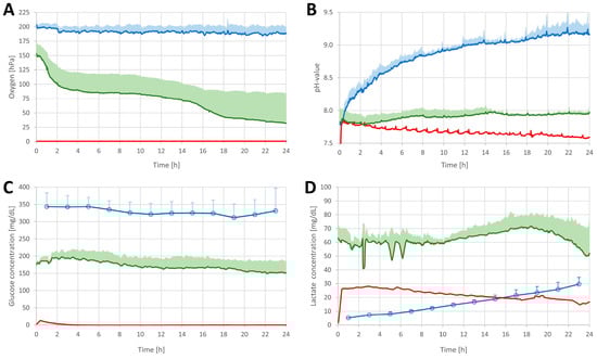 The oxygen sensor was referenced using air-saturated water (100%) or oxygen-free water (0%) by using Oxcal (PyroScience, Aachen, Germany). The pH sensor was referenced using calibration capsules pH 2 and pH 10 (both from PyroScience, Germany). Glucose and lactate sensors were tested individually, before and after the investigations, using 3 individual referenced stock solutions per analyte within the operation range, to determine drift, sensitivity loss, or sensor damage. For retrospective analysis, false values caused by air bubbles were excluded and linearly interpolated. Manual samples of the culture medium were taken frequently and analyzed offline for pH, glucose, and lactate. The removed volume was replaced, and unintentional evaporation was compensated with distilled water.