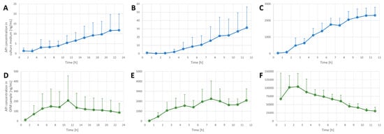Penetration tests in FTSE (n = 3) using acyclovir (A,D), diclofenac (B,E) and lidocaine (C,F). API concentrations were determined in FTSE culture medium (top row (A–C)) and in FTSE tissue by OFM sampling (bottom row (D–F)). Data are shown as the mean and SD (only upward error bars are shown for readability).