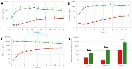 API concentrations in OFM samples from FTSE (n = 3, green) and skin explants (n = 4, red) for (A) acyclovir, (B) diclofenac, and (C) lidocaine. (D) Comparison of the total concentration of APIs in OFM samples in FTSE (green bars) and skin explants (red bars). Data are shown as the mean and SD (only upward error bars are shown for readability). ** p ≤ 0.01.
