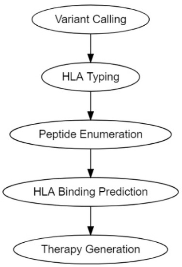 The traditional pipeline for computational tumor-specific antigen prediction segments itself into five distinct steps: variant calling, HLA typing, peptide enumeration, HLA binding prediction, and finally therapy generation (Figure 2) [30,113]. Variant calling involves predicting potential cancer antigens through methods that use data from high-throughput genetic sequencing (RNA-Seq or DNA-Seq). This genetic data is processed through algorithms best suited to predict the potential antigenicity of a TSA, depending on its mutational origin: SNV, INDEL, frameshifts, fusion proteins, endogenous retroelement, or hERVs [30,113,114]. HLA typing is performed to determine HLA allele frequencies [30,113,115]. Peptide enumeration is done to determine the peptide sequences of the potential antigenic mutants and to sort them from incompatible antigenic sequences that arise from non-sense mutations and other non-functional genetic aberrations [30,113,116]. HLA binding prediction is enacted to determine the binding of affinity of the antigenic peptide to the corresponding HLA molecule. This HLA-to-peptide affinity quantification is usually expressed as either a ranked percentile or a KD ≤ 500 nM (standard cutoff for detection) [80,117]. Finally, the genetic information gathered was utilized to make vaccine and cellular therapeutics such as DNA, RNA, peptide, and autologous DC or T-cell vaccines.