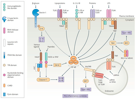 Schematic representation of the structure and main signaling pathways of the PRR families. Only the adaptor molecules and the main signaling pathways that differentiate the different classes of PRR are shown. Dectin-1 (a β-glucan receptor) is shown as an example of various cell-surface PRRs, some belonging to the lectin-like family, and some linked with the immunoreceptor tyrosine-based activation motif (ITAM)-containing adaptor Fc receptor γ-chain (FcRγ), the activation of which can markedly affect TLR signaling. ASC, apoptosis-associated speck-like protein containing a CARD (caspase-recruitment domain); ds, double-stranded; IFN, interferon; IκB, inhibitor of NF-κB; IL, interleukin; IPAF, ICE-protease-activating factor; IRF, IFN-regulatory factor; LPS, lipopolysaccharide; MDA5, melanoma-differentiation-associated gene 5; MyD88, myeloid differentiation primary-response gene 88; NALP, NACHT-, LRR- and pyrin-domain-containing protein; NOD, nucleotide-binding oligomerization domain; RICK, receptor-interacting serine/threonine kinase; RIG-I, retinoic-acid-inducible gene I; ss, single-stranded; TBK1, TANK-binding kinase 1; TIRAP, Toll/IL-1R (TIR)-domain-containing adaptor protein; TRAM, TRIF-related adaptor molecule; TRIF, TIR-domain-containing adaptor protein inducing IFNβ; SYK, spleen tyrosine kinase. Adapted with permission from [149]. Copyright 2007, Springer Nature.