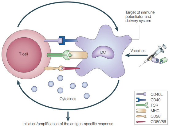 The interactions between APCs and antigen-specific T cells. Adapted with permission from [150]. Copyright 2003, Springer Nature.