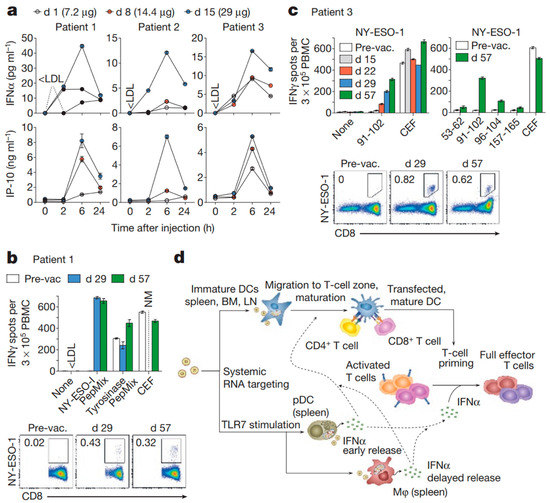 (a) Serum cytokines before (0 h) and after injection of intra-patient escalated doses. (b,c) T-cell responses against NY-ESO-1 and tyrosinase determined by restimulation with overlapping peptide mixtures or NY-ESO-1 epitopes (indicated with the amino acid position) in IFNγ ELISPOT- and NY-ESO-1-specific MHC class I dextramer staining for patients 1 (b) and 3 (c). CEF, cytomegalovirus, Epstein–Barr and influenza viruses peptide pool; NM, not measured; PepMix, peptide mixture; pre-vac., pre-vaccination. (d) Mechanism of action for RNA-LPX. Error bars, mean ± s.e.m. Reprinted with permission from [152]. Copyright 2016, Springer Nature.