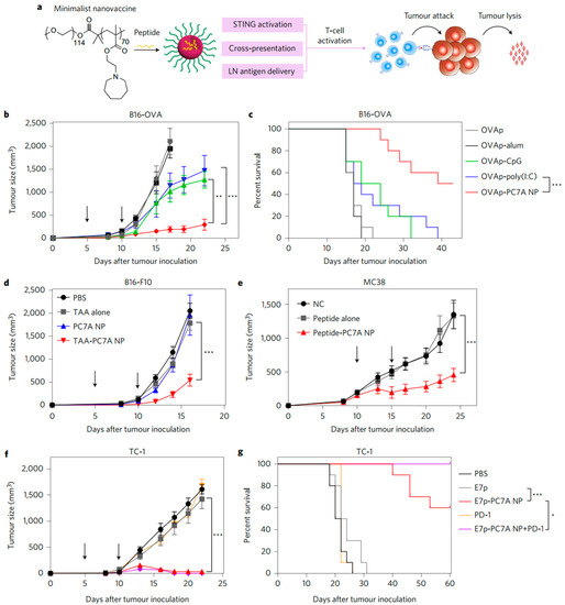 (a) Schematic of the minimalist design of the PC7A nanovaccine. (b,c) C57BL/6 mice (n = 10 per group) inoculated with 1.5 × 105 B16-OVA tumor cells were treated with OVA peptide, PC7A nanovaccine, CpG, poly(I:C) and alum plus peptide (0.5 µg). Tumor growth (b) and Kaplan–Meier survival curves (c) of tumor-bearing mice are shown. (d) Tumor growth inhibition study of B16-F10 melanoma. C57BL/6 mice (n = 10 per group) inoculated with 1.5 × 105 B16-F10 tumor cells were treated with a cocktail of tumor-associated antigens (Gp10021–41, Trp1214–237, Trp2173–196) in PC7A NPs at specific time points, indicated by arrows. (e) Tumor growth inhibition study of MC38 colon cancer in C57BL/6 mice. Mice (n = 10 per group) inoculated with 1.0 × 106 MC38 tumor cells were treated with a cocktail of neoantigens (Reps1P45A, AdpgkR304M, Dpagt1V213L) in PC7A NPs, and nanovaccine was administered on days 10 and 15 in established tumors (100–200 mm3). (f,g) In the HPV tumor model, tumor growth inhibition (f) and survival data (g) in C57BL/6 mice (n = 10 per group) were analyzed after tumor inoculation with 1.5 × 105 TC-1 tumor cells. In (b,d–f) data are presented as means ± s.e.m. Statistical significance was calculated by Student’s t-test: *** p < 0.001, ** p < 0.01. Statistical significance for survival analysis in (c,g) was calculated by the log-rank test: *** p < 0.001, * p < 0.05. Reprinted with permission from [154]. Copyright 2017, Nature Springer.