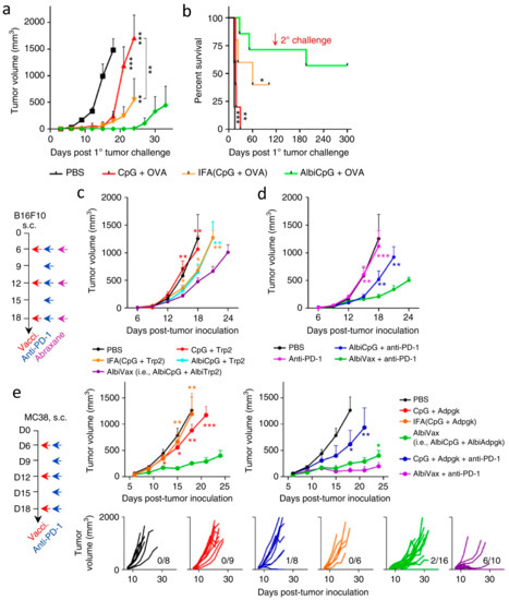 (a,b) Tumor growth curves and mouse survival after s.c. challenging vaccinated mice with EG7.OVA cells. The 1° challenge: 3 × 105 cells on the right shoulder on day 71 post priming vaccination; the 2° challenge: 1 × 106 cells on the right flank on day 211. (c,d) B16F10 tumor growth after treatment with AlbiVax, double combination of albumin/AlbiVax nanocomplexes and anti-PD−1. C57BL/6 mice were s.c. inoculated with 3 × 105 B16F10 cells, treated with AlbiVax (2 nmol CpG equivalents + 20 µg AlbiTrp2) (day 6, day 12, and day 18), anti-PD-1 every 3 days from day 6 for five times (200 µg). (e) MC38 tumor growth after treatment with AlbiVax alone or in combination with anti-PD-1. C57BL/6 mice were s.c. inoculated with 3 × 105 MC38 cells, treated with AlbiVax (2 nmol AlbiCpG + 20 µg AlbiAdpgk) on day 6, day 12, and day 18, and with anti-PD-1 (200 µg) every 3 days from day 6 for six times. *** p < 0.001, ** p < 0.01, * p < 0.05, by one-way ANOVA with Bonferroni post-test. Adapted from [225] with Creative Commons CC BY license.