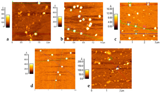 The morphology of the targeted NMeds was evaluated by Atomic Force Microscopy (AFM, Park Instruments, Sunnyvale, CA, USA) at RT operating in air and non-contact mode using triangular silicon tips. The resonant frequencies of the cantilever were found to be in the range of 160 kHz. Before the analysis, the NMeds were diluted to 0.01 mg/mL, applied to a small mica disk (1 cm × 1 cm), and analysed after removing the excess solution. The topographical images were flattened using second-order fitting to remove sample tilt.