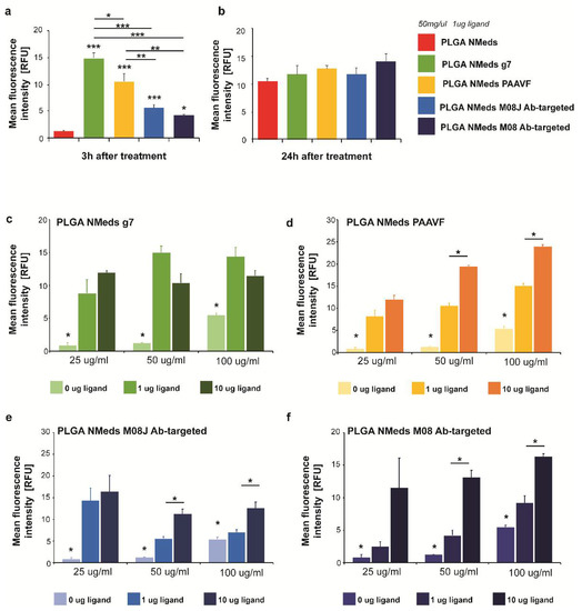 C6 cell uptake of 50 µg/mL targeted and non-targeted NMeds at (a) 3 h and (b) 24 h after administration. The relative fluorescence intensity of Cy5 intracellular signals (normalised to background fluorescence of untreated cells) was measured in 10 cells from n = 3 samples per condition. (c–f) Uptake of non-modified and targeted NMeds surfaced modified with 0, 1, or 10 µg of each ligand and administered at concentrations of 25, 50, or 100 µg/mL. The relative fluorescence intensity of Cy5 intracellular signals (normalised to background fluorescence of untreated cells) was measured in 10 cells from n = 3 samples per condition. Statistical analysis was performed with one-way ANOVA and post hoc test, * p < 0.5, ** p < 0.1, *** p < 0.01. Full statistical analysis is available in Supplementary material Table S5.