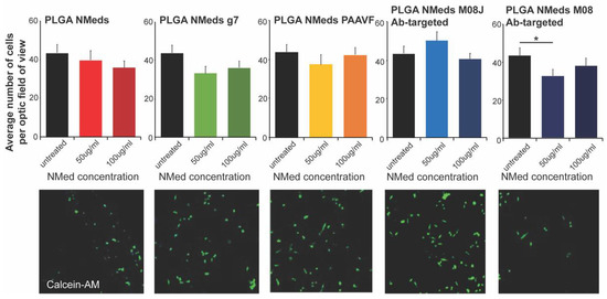 Further analysis of cell uptake determined the cell viability based on the number of cells remaining per field of vision (Figure 3). Cells were treated with 50 or 100 µg/mL of NMeds surface modified with 10 µg of each ligand. It was apparent that at these concentrations, the unmodified and targeted NMeds did not affect cell proliferation. The only exception was the M08 modified NMeds. At 100 µg/mL, no variation in cell number was seen. This was probably due to the presence of larger NMed aggregates that inhibited the uptake; however, at 50 µg/mL, M08 targeted NMeds led to a statistical decrease in cell number.