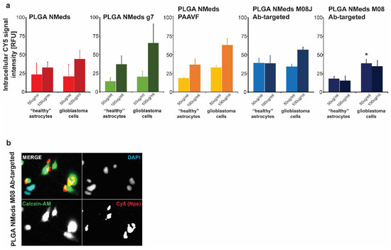 Cell uptake and growth inhibition studies. (a) Uptake in C6 (GBM) and DI TNC1 (“Healthy” astrocytes) cells after the administration of 50 and 100 µg/mL of targeted and non-targeted NMeds with 10 µg of each ligand after 3 h. Statistical analysis was performed with one-way ANOVA and Post hoc analysis, * p < 0.05; n = 8. (b) A representative image of M08 targeted NMeds, colocalizing with C6, but not DI TNC1 cells. Red: Cy5 (NMeds), blue: DAPI, green: Calcein-AM.