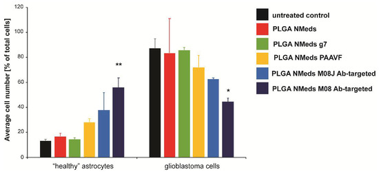 Moreover, the experiment was repeated to analyse the total number of each cell type (Figure 5). Untreated co-culture wells showed that the cell growth between the two cell lines led to a ~80:20 ratio of C6:DI TNC1 cells. This could be explained by the faster cell division rate of C6 cells over healthy astrocytes and the potentially invasive nature of C6 cells, which could lead to them spreading out and occupying more surface space in the well, “choking out” astrocyte growth. This growth ratio was maintained with non-targeted, AAVF, and g7-targeted NMeds, suggesting no effect on cell proliferation; however, M08J targeted NMeds did show a difference. Here, the “healthy” astrocytes increased to up to 40%, with a corresponding decrease in C6 cells to 60%.