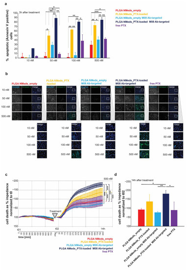 Effect of PTX-loaded NMeds on cell health of C6 glioblastoma cells. (a) Quantification of apoptosis using FITC-Annexin V. The percent of Annexin V positive cells of total cells is shown as average from n = 3 OFV. C6 cells were treated for 3 h with empty non-targeted and M08-targeted NMeds, and non-targeted and M08-targeted NMeds delivering the equivalent of 10, 50, 100, and 500 nM PTX. Free PTX at the same concentrations was used as controls. (b) Representative images showing all cells. The visualisation was achieved by labelling the nuclei with Hoechst staining and labelling apoptotic cells with Annexin V-FITC. (c,d) Cell impedance measurement after treatment with empty non-targeted and M08-targeted NMeds, as well as their PTX loaded counterparts (the equivalent of 500 nM PTX) and compared with500 nM free PTX as a control treatment. Before treatment, cells were grown for 12.5 h (t01—750 min). n = 3 per treatment. Cell death was evaluated as a decrease in impedance and shown as % of t0. (d) Cell death analysis at the 14 h endpoint of the treatment shown in (c). One-way ANOVA analysis and Tukey’s Post hoc tests were performed, * p < 0.05, ** p < 0.01, *** p < 0.001.