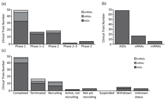 Summary of clinical trials therapies using oligonucleotide in oncology. (a) Antisense oligonucleotides (ASOs), small interfering RNAs (siRNAs) and microRNAs (miRNAs) number of clinical trials divided for clinical phases; (b) Total clinical trials number for each class of oligonucleotide analyzed; (c) ASOs, siRNAs and miRNAs number of clinical trials divided for clinical status condition.