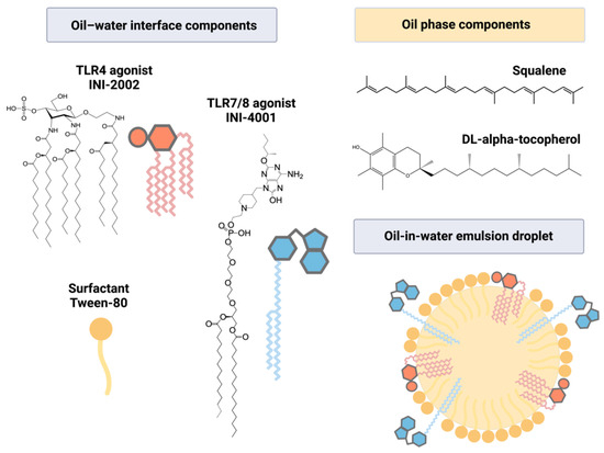 Structures of compounds incorporated in a squalene-based emulsion. INI-4001, a lipidated oxoadenine and TLR7/8 agonist, and/or INI-2002, a synthetic TLR4 agonist, were incorporated into an AddaS03-like emulsion. Lipid moieties present in the compounds allowed incorporation into the oil–water interface, along with the surfactant Tween-80. The oil phase was comprised of squalene and DL-α-tocopherol.
