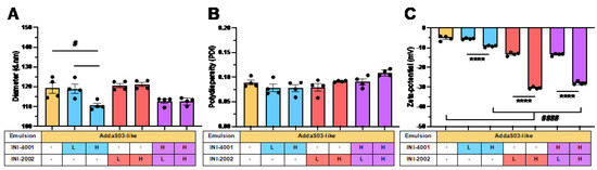 Effect of incorporation of INI-4001 and INI-2002 on hydrodynamic diameter, polydispersity (PDI), and zeta potential in AddaS03-like emulsions. INI-4001 or/and INI-2002 were incorporated alone or in combination into AddaS03-like emulsions at “low” (L) 0.175 mM or “high” (H) 1.75 mM target concentrations. Dynamic light scattering was used to measure (A) hydrodynamic diameter (Z.Avg, nm), (B) PDI, and (C) zeta potential (mV) at a pH of 6.7–6.8. Physical properties are given as mean ± SEM with black dots representing each replicate emulsion (n = 4). A one-way ANOVA with a post hoc Tukey’s test for multiple comparisons demonstrated significant differences between group means within compound concentrations (**** p < 0.0001) or when compared or to the AddaS03-like vehicle (# p < 0.05, #### p < 0.0001).