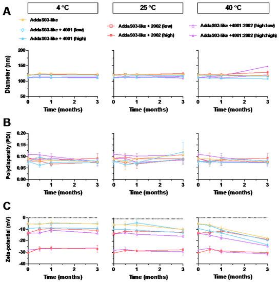 In order to measure the colloidal stability of AddaS03-like emulsions containing low and high concentrations of INI-2002, INI-4001, or combinations of the two, the emulsions were stored at 4 °C, 25 °C, and 40 °C to resemble refrigerated, room temperature, or high temperature storage, respectively. The results demonstrated no changes to the droplet size, polydispersity, or zeta potential over the course of the experiment at 4 °C or 25 °C (Figure 4). Thus, the addition of INI-2002 and INI-4001, alone or in combination, had no observable effect on the colloidal stability when compared over time. While the duration of this study was 3 months, AS03™ is highly stable for up to 10 months at 4 °C [53] and resistant to temperature fluctuations [16]. Since the addition of the TLR agonists resulted in minimal changes to the hydrodynamic diameter and PDI, we expect the colloidal stability to be similar. Additionally, previous results indicate that emulsions with a higher magnitude of zeta potential are more colloidally stable due to the charge repulsion of droplets [69]. Informally, we observed no change in the droplet size, polydispersity, or zeta potential for up to 6 months at room temperature and 9 months for the refrigerated emulsions (results not shown).