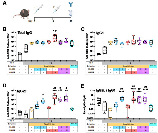 Addition of TLR4 and/or TLR7/8 agonists to AddaS03-like emulsions increases RBD-specific IgG2c antibody titers without reducing total IgG or IgG1 titers. (A) C57BL/6 mice were immunized twice with recombinant SARS-CoV-2 RBD admixed with emulsions containing INI-4001 (TLR7/8 agonist) or INI-2002 (TLR4 agonist), singly or dually encapsulated. Agonists were administered at a low dose (L, 0.876 nmol) or high dose (H, 8.76 nmol). Fourteen days after the booster immunization, anti-RBD serum antibody titers were measured for (B) total IgG, (C) IgG1, (D) IgG2c, and (E) the ratio of IgG2c/IgG1. Results are presented as box-and whisker plots representing the group median with quartiles (box) and range (whiskers) overlaid with data from individual animals. A Kruskal–Wallis test with a post hoc Dunn’s multiple comparisons test was used to determine significant differences in group mean rank when compared to AddaS03-like (* p < 0.05, ** p < 0.01, *** p < 0.001, and **** p < 0.0001) or MF59-like (# p < 0.05, ## p < 0.01) emulsions alone.