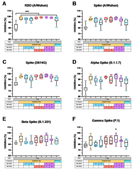 The sera from mice adjuvanted with squalene-based emulsions more effectively inhibited the binding of ACE2 to SARS-CoV-2 RBD (A/Wuhan), the spike protein (A/Wuhan), the spike protein containing the common D614G mutation, and the spike protein from the Alpha variant (B.1.1.7) compared to the sera from mice immunized with RBD alone (p < 0.0001 for each). Specifically, AddaS03-like emulsions resulted in percentages of binding inhibition of 97.5% for the A/Wuhan RBD, 95.3% for the A/Wuhan spike protein, 97.5% for the D614G spike protein, and 97.5% for the Alpha spike protein. The TLR agonist addition to AddaS03-like emulsions did not significantly increase these figures. For the Beta (B.1.351) and Gamma (P.1) variants of concern, the AddaS03-like emulsion provided 89.0% and 86.3% inhibition of binding to the spike protein, though neither was significantly higher when compared to the mice immunized with RBD alone. Similarly, the TLR addition did not increase these figures.