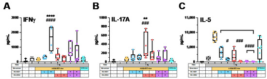 The draining lymph nodes (DLN, inguinal and popliteal) were collected following the sacrifice at fourteen days post-secondary immunization. The DLN cells were isolated by mechanical disruption, and 200,000 cells from each animal were plated per well in 96-well plates and restimulated with 10 µg/mL of RBD in RPMI containing 10% FBS for 72 h. When necessary, the cells from two animals were pooled together in order to achieve sufficient cell numbers. At 72 h, the cells were centrifuged for 5 min at 400× g, and the supernatants were collected and stored at −20 °C until they were assayed for RBD-specific IFNγ, IL-17A, and IL-5 cytokines. The cytokine concentration was determined using a U-Plex multiplex ELISA kit (Meso Scale Diagnostics) according to the manufacturer’s instructions.