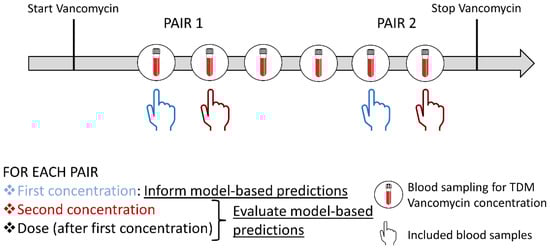 Schematic representation of the inclusion of two pairs of two consecutive vancomycin concentrations using a random example as illustration. The first concentration of each pair was used to inform the model-based predictions. The second concentration was blinded from the models and was used to evaluate the performance of the model-based prediction. The model-predicted dose after the first concentration was used to evaluate the model-based doses compared with the standard TDM-based doses.