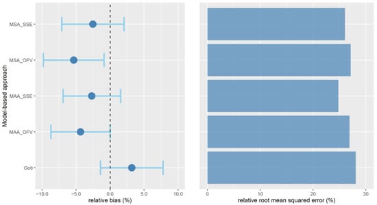 Two different criteria to assess the models’ fit metrics were evaluated: the objective function value (OFV) and the squared prediction errors (SSE). These weighting schemes were described in detail previously []. The MSA and MAA were evaluated according to these two weighting schemes. As such, we evaluated five different model-based approaches in this study: the Goti model, the MSA with weighting according to the OFV (MSAOFV) or the SSE (MSASSE), and the MAA with weighting according to the OFV (MAAOFV) or the SSE (MAASSE).