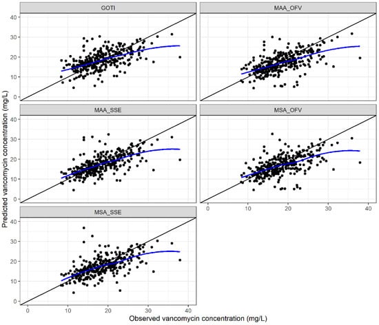 Goodness-of-fit plots of the predicted versus observed second vancomycin concentration of each pair for the five model-based approaches (i.e., the model selection algorithm [MSA] and the model averaging algorithm [MAA], according to the objective function value [OFV] and the squared prediction errors [SSE], and the single-model approach according to the Goti model). The blue line represents the local polynomial regression fit. The line of identity represents a perfect model fit.